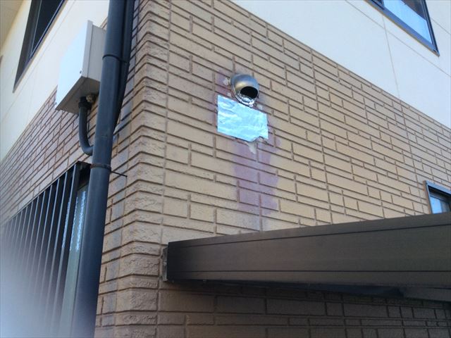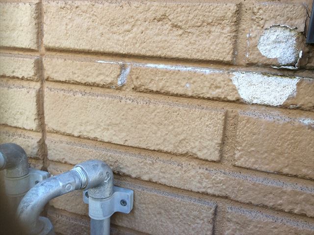 お風呂の換気扇回りの状況です。お風呂からの換気なので当然水分たっぷりの蒸気が出てきます。その水分がALCの気泡に入り、凍結、膨張して外壁内部から破壊される爆裂が起きています。色が変わっているのは水分による変色です。