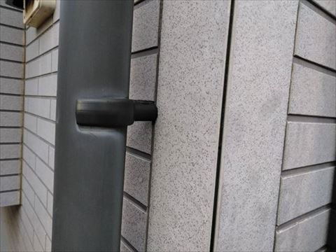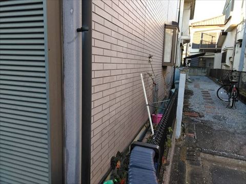 出隅(建物の角)を納める部材ですが、板と板をつなぎ合わせているのでそれが離れて隙間が出てしまっています。通常ここはL字型の部材1枚でコの直角を納めなければなりません。施工ミスもしくは部材の選択ミスです。ここからも雨水が入り込んでしまいます。