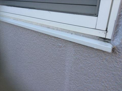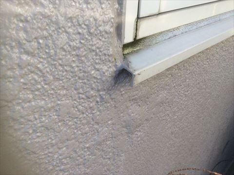 左の写真のL型の金具の下に膨らんだような跡があるのが見えるでしょうか?水がここを通って先ほどの大きく水風船のように膨らんだところにたまったのだと思います。その跡をたどっていくと右の写真のL型の金具の上にたどり着きます。L型の金具と窓枠の間にシーリング材が打たれています。シーリング材とは隙間を埋めてそこから水が浸入するのを防ぐ、防水の役割をするゴム状の材料です。本来ゴム状なのですが経年で硬くなりひびが入ったり、痩せて隙間ができてしまったりします。そこから水が入ってしまうといろいろな不具合が生じます。この塗膜の膨れもその不具合の一つです。5年前の塗り替えの際にシーリングの打ち替えもしていれば、このような悲劇が起きなかったのだろうと思います。