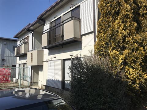 塩尻市宗賀にあるアパートの外壁を見てほしいと、いつもお世話になっているお客様からご依頼がありました。塩尻市宗賀は塩尻名産のブドウの畑が広がる長閑なところです。でも最近はブドウ畑を宅地に変えて分譲したり、アパートを建てたりと少々様変わりしている地域です。そんな一角にあるアパートでした。規模は2LDKくらいでしょうか、4世帯入るアパートです。