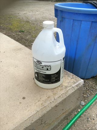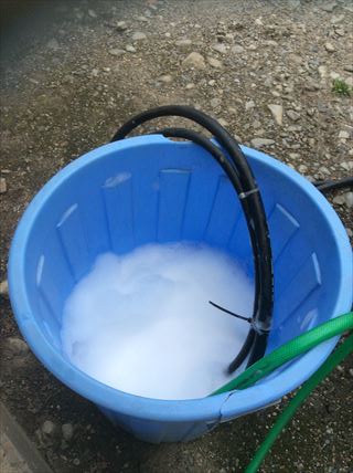 こちらがコムスタージャパンのバイオ洗浄剤キムケアーです。無臭、無害、無公害の安全な環境にやさしい洗浄剤です。バケツの水にキムケアーを少しずつ入れて、バケツの水は洗浄機のポンプで吸い上げてホースから射出します。外壁材やその状態によって水圧をコントロールして洗浄していきます。