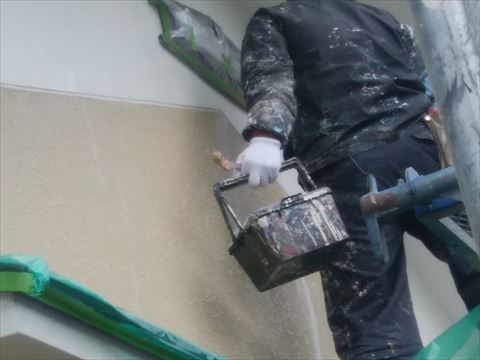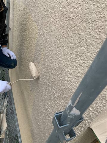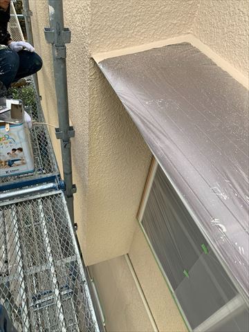 既存の外壁の色になるべく近い色とのご指定です。こちらは中塗り作業ですが外壁がシーラーの下塗りでピッカピカになったので仕上がりと見間違えそうです(笑)