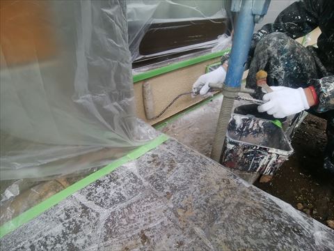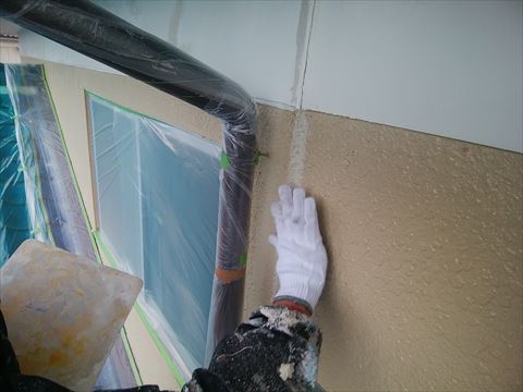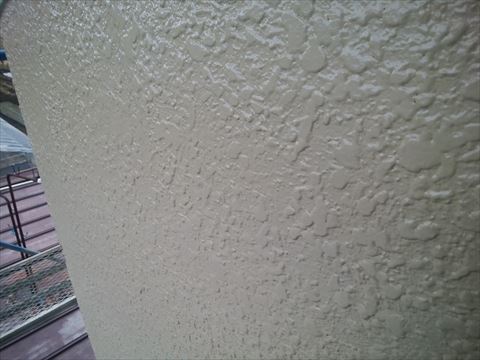 既存の外壁はモルタル壁タイル吹き付け塗装です。吹き付けタイル塗装はリシン吹き付け塗装よりも高価で、厚く塗膜が付いています。しかし厚いだけに塗膜が劣化してチョーキングし始めると、雨水を吸い込んで雨染みになりどんどん外壁がもろくなってしまいます。雨の日にご自宅の外壁をご覧になって下さい。雨染みが見えましたら専門家による無料点検をお勧めいたします。