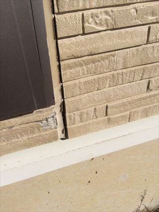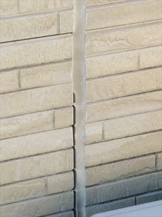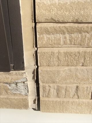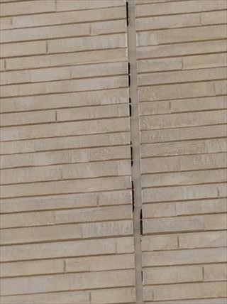施工不良なのか、サイディングの板が粗悪品だったのか、構造上に問題があるのか、地盤が緩いのか、いろいろな要素が絡み合ってのものなのか、考えられる原因はいくつもありますが、とにかくひどい状況です。窯業系サイディングなのでサイディングの板と板の間の目地にはシーリングが施されています。窯業系サイディングは1日のうちの昼夜、年間の夏冬、温度差でいたが伸び縮みします。シーリング材はある程度この伸縮についていかなければなりません。ついていけないとサイディング板とシーリング材がはがれてしまいます。
