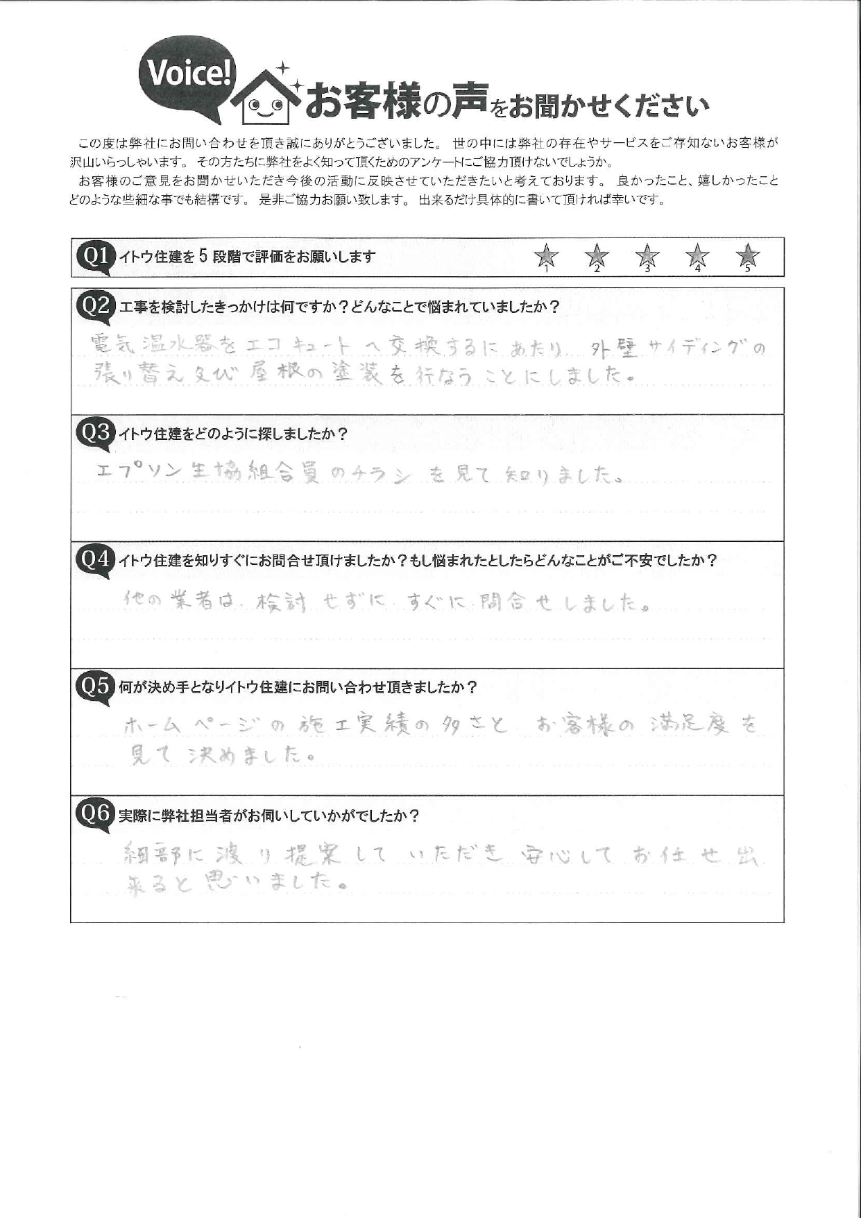 中箕輪で施工致しました屋根塗装と外壁重ね張り工事のご感想を頂きました