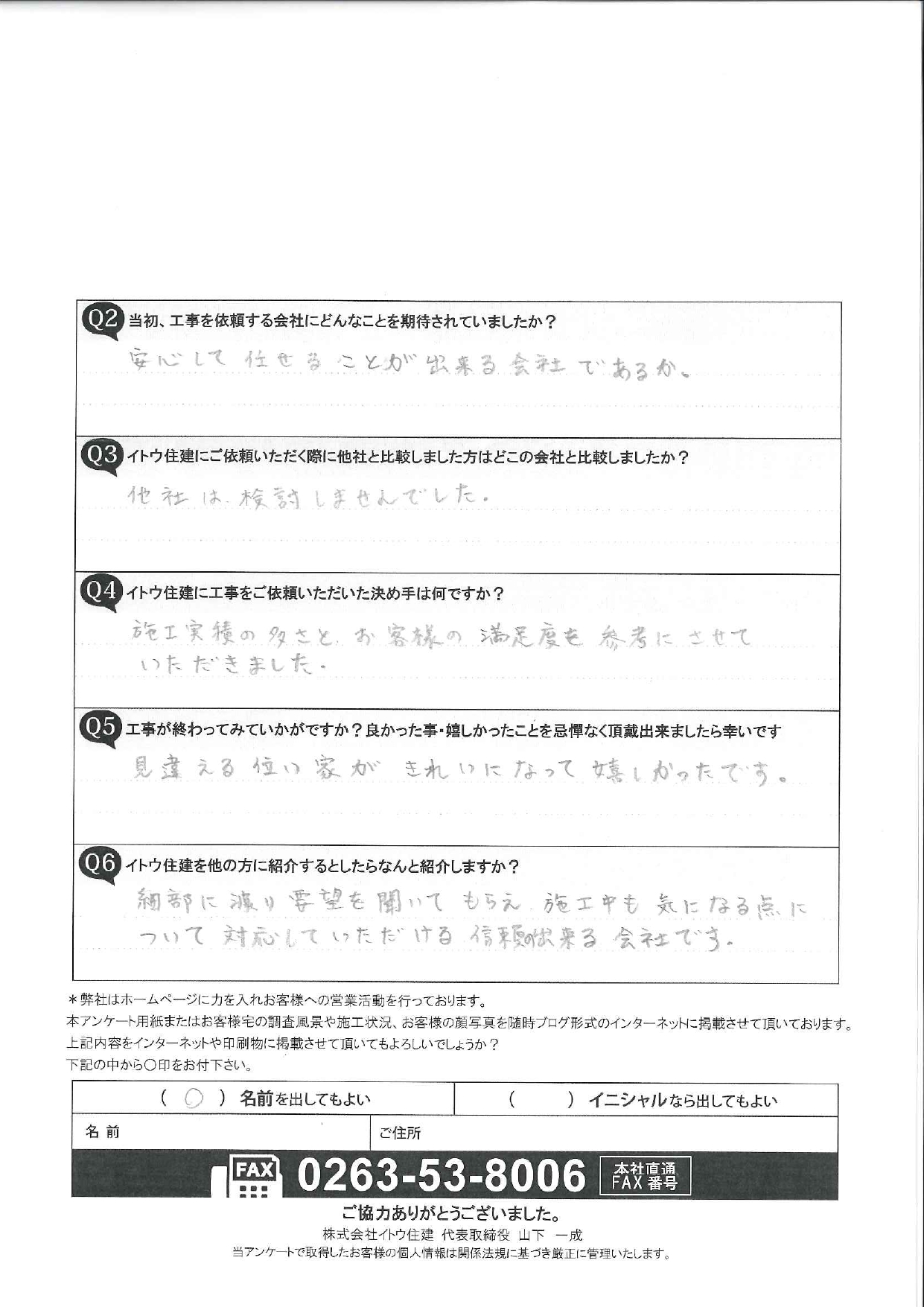 細部に渡り要望を聞いてもらえ、施工中も気になる点について対応していただける信頼のできる会社です。