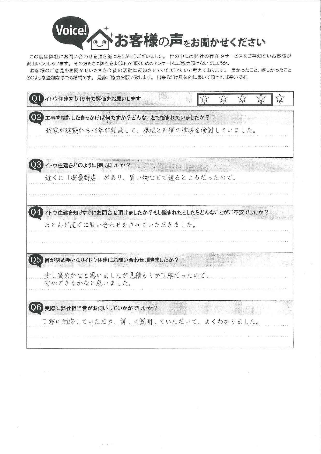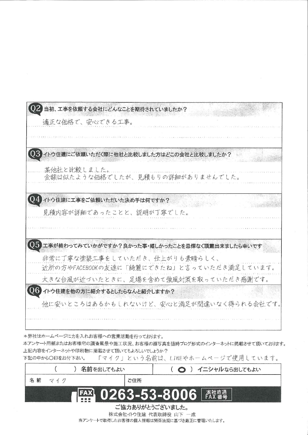 松本市で行いました屋根外壁塗装のお施主様からご感想を頂きました