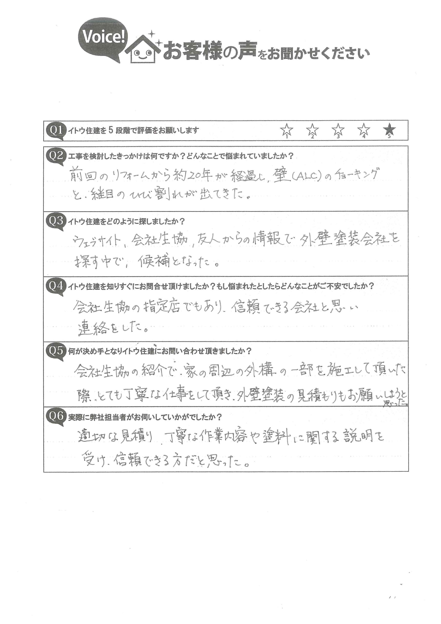 会社生協の紹介で、家の周辺の外構の一部を施工して頂いた際、とても丁寧な仕事をして頂き、外壁塗装の見積もりもお願いしようと思った。