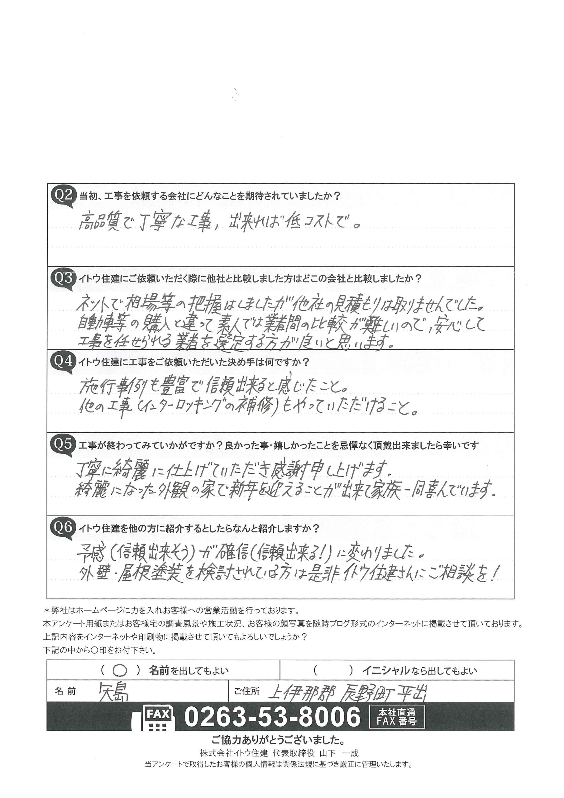 辰野町|屋根外壁フッ素塗装のお施主様からご感想を頂きました