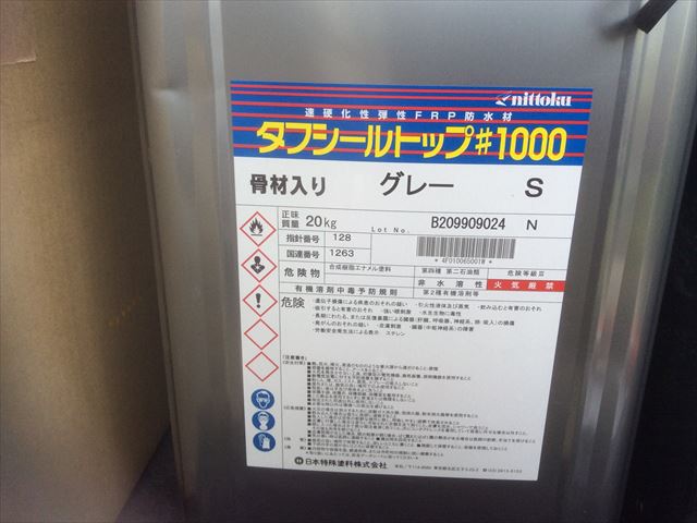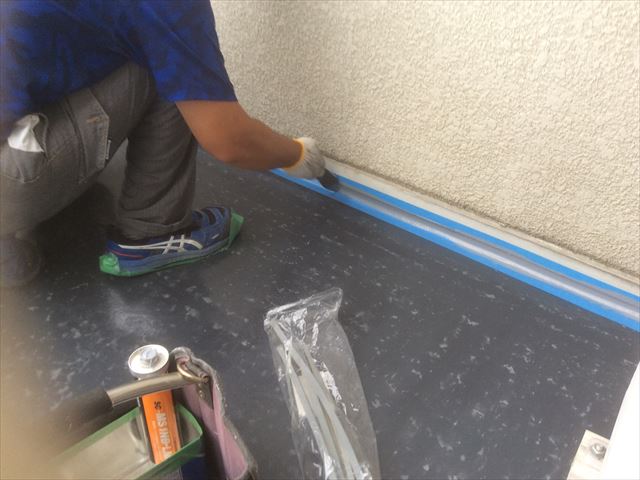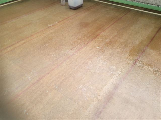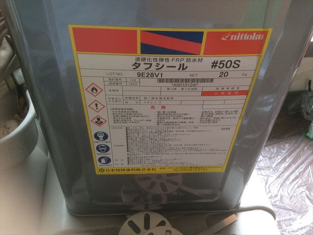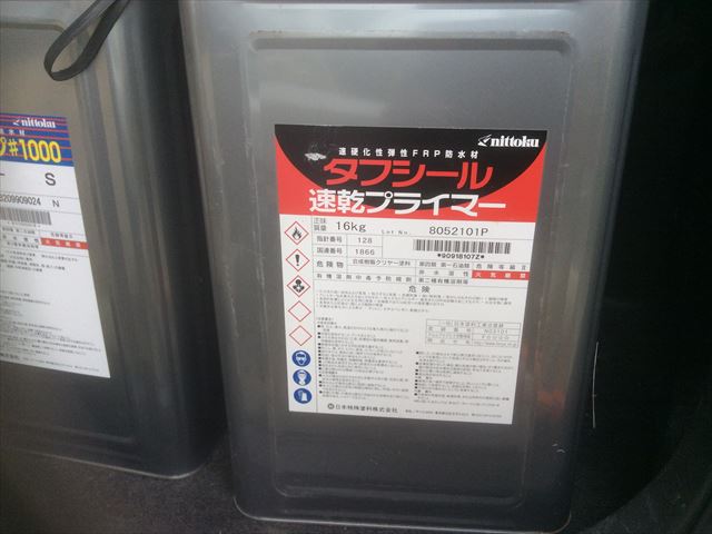 ガラス繊維とタフシールが乾いたら、中塗りの工程になります。中塗りは同じく日本特殊塗料のタフシール速乾プライマーです。このプライマーもこの後塗るトップコートとガラス繊維層の密着をよくする役割があります。