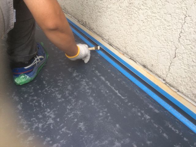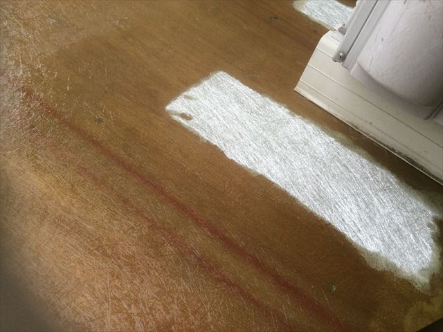 FRP防水の要になるガラス繊維シートを張り付けていきます。使う塗料は日本特殊塗料のタフシールです。白く見えるのが張り付ける前のガラス繊維シートです。FRPとは Fiber Reinforced Plastics(繊維強化プラスチック)の略で、文字通りガラス繊維で強化されたプラスチックです。バルコニーなどの防水には一般的に良く使われているほか、船底にも使われているので防水性は信頼できます。