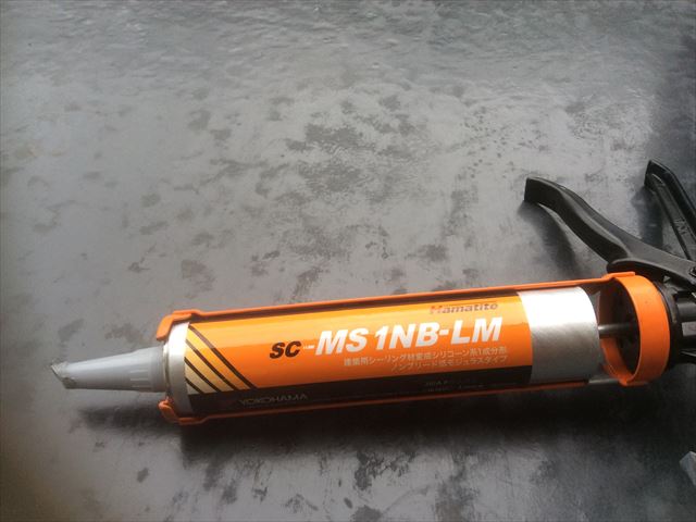 プライマー塗布後、シーリング材を専用のガンで押し出しながら打っていきます。大目に抽出してヘラで抑えて打ち損じがないよ王に売っていきます。