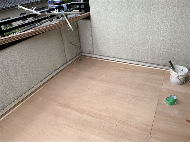 既存の塩ビシートをすべて撤去して、新たに12mm厚の構造用合板を敷き、その上にFRP防水を施工しました。その様子をご紹介します。