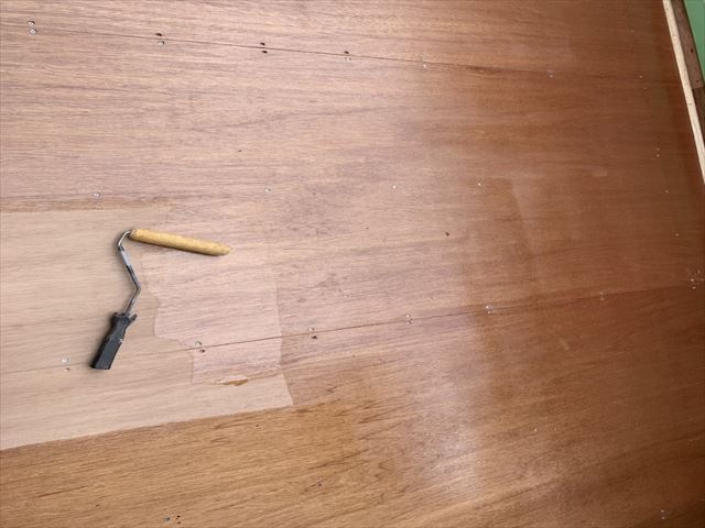 構造用合板とこの後張り付けるガラス繊維シートの密着をよくするための下塗り材を塗布します。濃く見えるところが塗布後です。