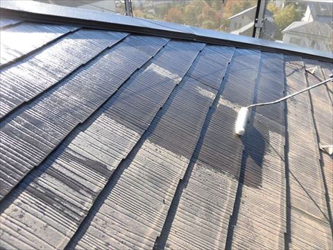 高圧洗浄後、乾燥したスレート瓦にローラーでプライマーをしたたるほど塗りしみこませていきます。