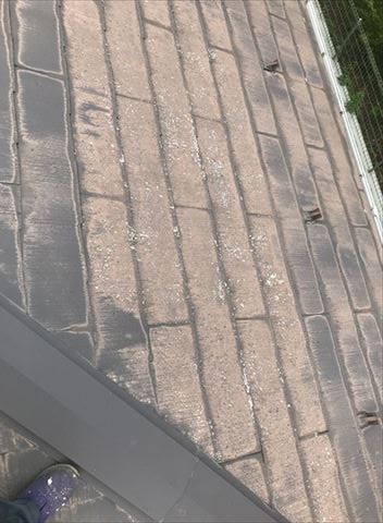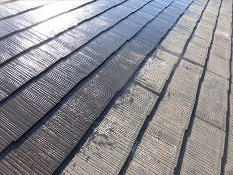 屋根材のスレート瓦。コロニアルやカラーベストとも呼ばれています。スレート瓦は軽くて錆びないので現在の新築でも広く一般的に施工されている商品です。しかしやはり劣化は致します。