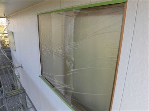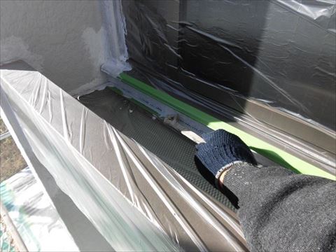 窓養生。この作業で塗装面と未塗装面の境目(チリ)がハッキリとでます。職人の技術力もハッキリと差がでます。
