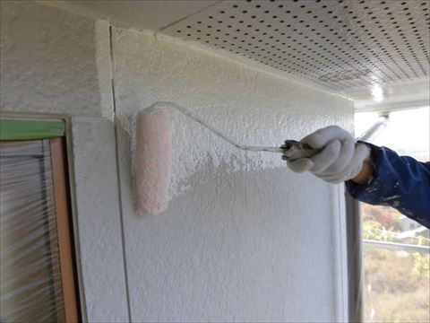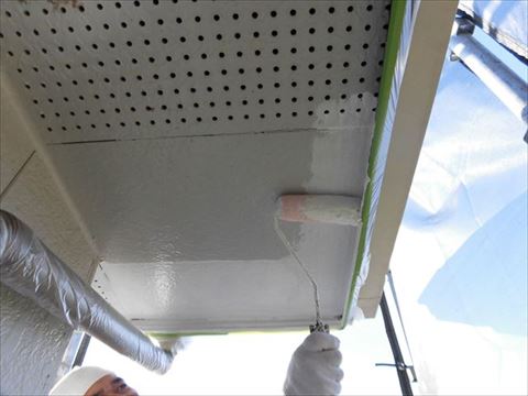 軒の天井の中塗り。こちらの軒天はサイディング材で通気口があるために外壁と同じ塗料で仕上げていきます。軒天がケイカル板で通気口が無い場合はケンエース(日本ペイント)等の透湿性のある塗料を使用します。ちなみにケンエースは土蔵など調温・調湿の漆喰かべに使います。関西ペイントだと『アレスシックイ』です。