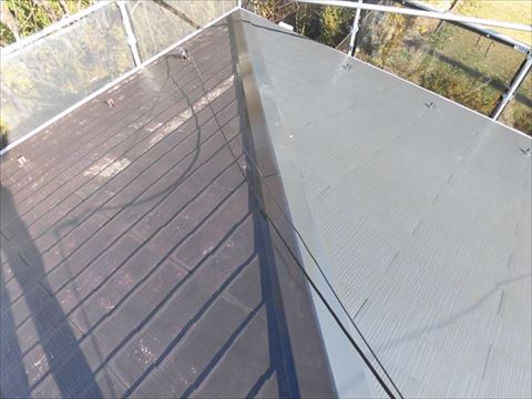 未塗装面との境目がご覧になれます。このように下塗りだけで輝きが出るほどしっかりと塗り固めていきます。棟の板金にはさび止めを下塗りします。