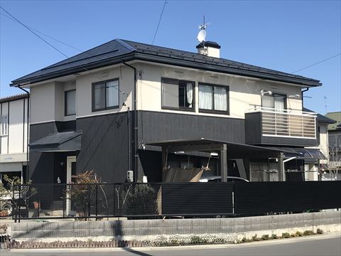 完工画像になります。1階部分は木目調縦張り2階部分はシンプルなホワイト系材料、ちなみに屋根の上の換気塔(煙突状の施工物)も2階部分と同材料で施工しました。余談ですが天窓からの雨漏り補修でお伺いしたおうちは壁は金属サイデイングのアルミ材で施工してありましたが、換気塔は既存のままでした。一応は材在庫のはる一番で施工しておきました。。。(屋根上の窯業系は劣化が著しいので)