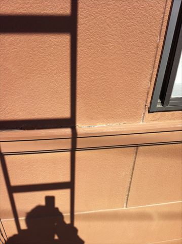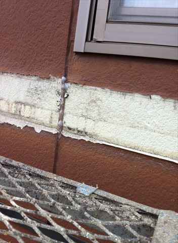 一階の掃き出し窓の上から強風、大雨の時雨漏りするという事で施工前点検しています。外壁の中央部に幕板がデザインとして回ってます。雨漏りとは別の事になりますが、幕板の上は三角シーリングをして、雨水の侵入を防ぐ事が、外壁塗装する場合は大事な作業になります。何故かといえば、窯業の幕板は本体の壁材に使われている窯業サイデイング材より品質がランク落ちしてるものが多いからです。三角シーリングを怠ると幕板の裏側から雨水が浸透し塗膜の爆裂、幕板材の乾燥収縮が著しくなり、ジョイント部の隙間、そりが発生します。特に黒色等濃い目の色は要注意になります。