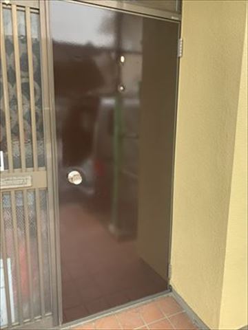 今回のお見積りにはドア塗装が入っておりませんでしたが、玄関周りが綺麗になりますと、いままで目立たなかったドアの色の劣化が気になります。ご要望にはありませんでしたが、お施主様に確認いたしまして今回はサービス施工をさせて頂きました。