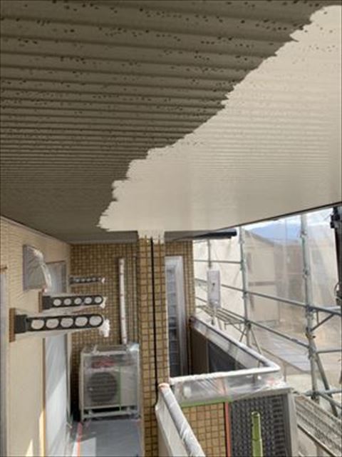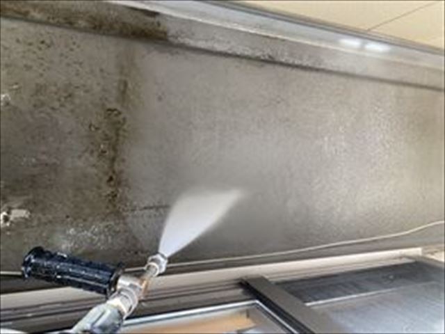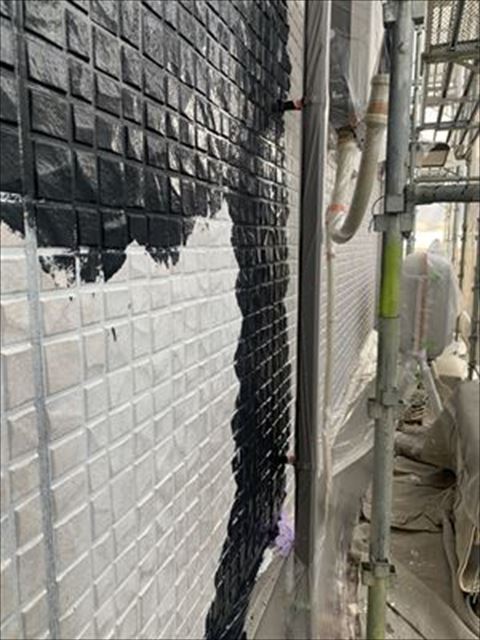 パナホームさんに多い、横2本の胴差(付け柱又は帯)も塗装致します。この部分の材質は樹脂なので、下塗りには染Qのミッチャクロンを塗ります。樹脂に直接塗料を塗ると剥がれてしまいますよ。