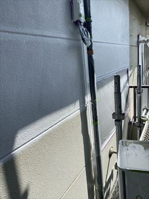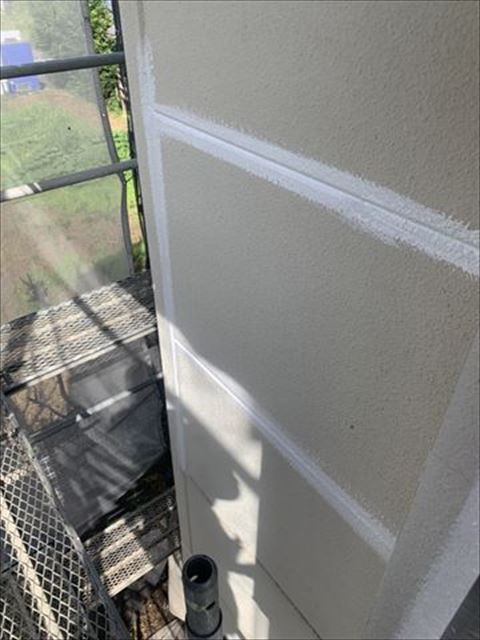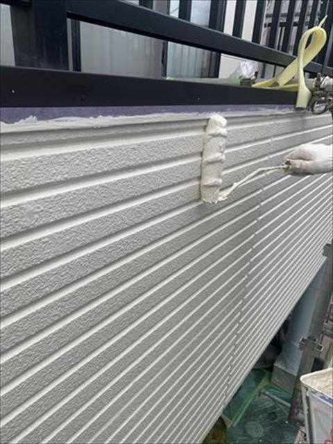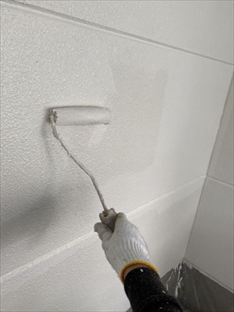 上塗りの様子です。上塗りは中塗りと同じ塗料を使用いたします。同じ塗料でも乾いたところと塗りたてで乾いていない所では色味が違いますので、塗り忘れが出ることはございません。