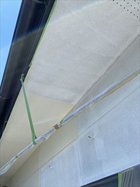 今回は目地の剥がれ等もなかったため、フィラーでカバーしました。目地部分はローラーで塗料が入りませんので、刷毛で塗っていきます。目地の割れなどもございますので、固めに希釈してヒビ埋めをしていきます。目地部分のダメ込みが済んだらローラーで塗膜を作っていきます。今回のお宅の既存の軒天は外壁と同じ塗料が塗装してありましたので、今回も外壁と同じ塗料で塗り上げます。