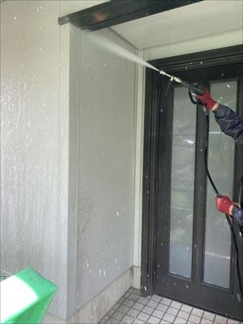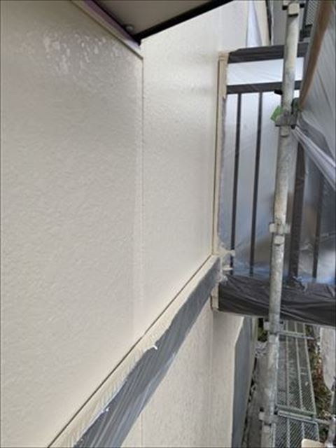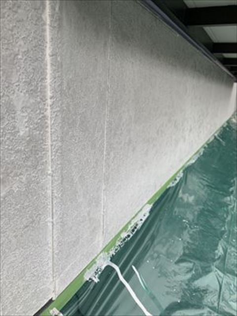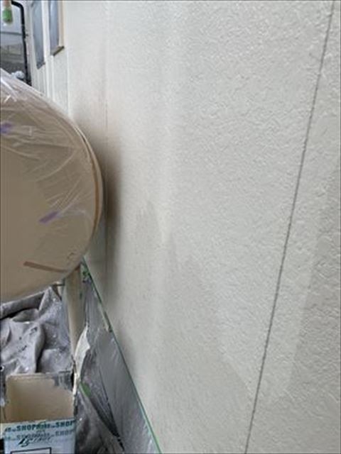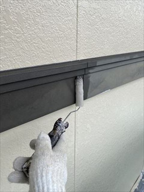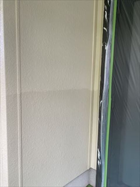本来ですと、積水ハウスさんのFパネルのような塩ビ皮膜鋼板は、塩ビ皮膜専用塗料を使用いたします。しかし今回は2度目の塗装で1度目が建築会社様の塗装ですので問題ございません。ここでいう問題とは、積水ハウスさんやハイムさんの外壁材は塩ビ皮膜鋼板を使用しています。塩ビ皮膜に通常の下塗りをしてしまうと硬化不良といって、いつまでも塗膜がベタベタする現象が起きてしまうことが御座います。