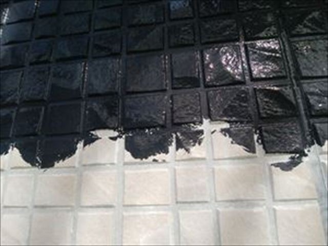 こちらは、中塗りになります。材料は、AGCコーテック(旭硝子)の「ルミステージ水性サンバリア」を使用しました。左側写真は1階部分、右側写真は2階部分になります。今回、施主様は1階部分を黒系統と2階部分を白系統のツートンでお塗り替えされました。
