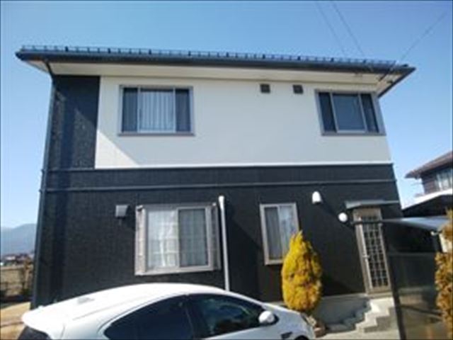 建てられた時も1階と2階のツートン色で素敵でしたが、今回は、思い切って黒系統色と白系統色にしました。コントラストがはっきりして、より素敵になりました。施主様も、大満足です。