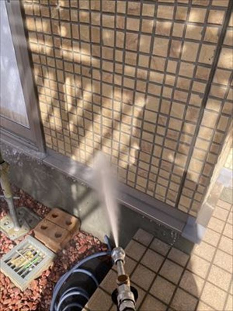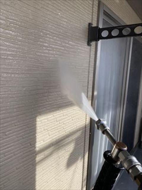 安曇野市で、パナホーム住宅の外壁塗装を行いました。高圧洗浄を行っている場面です。こちらの外壁は、NTC外壁に耐久性を高めるコーティングが施されています。お施主様は塗り替えに際しても、耐久性だけでなく「色あせ」もしにくい塗装を希望されていらっしゃいましたので、AGCコーテック(旭硝子)のフッ素塗料を選んでいただきました。AGCコーテック(旭硝子)が世界に先駆けて開発した塗料用高性能フッ素樹脂「ルミフロン」は、10年以上経っても「美しさが変わらない」塗料です。