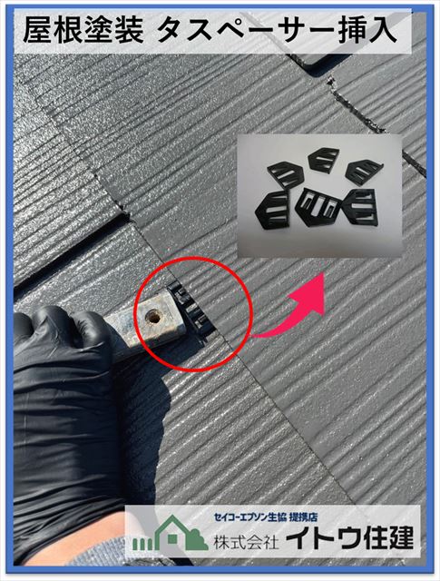 スレートは1段で1枚の屋根材です。重なりの部分には隙間があります。この隙間は屋根材の下に入ってしまった水を排出するための隙間です。塗装をすると塗料でこの隙間がふさがってしまう場合があります。それを防ぐためにタスペーサーという小さな部材を1枚につき5個くらい隙間に差し込みます。縁切り工法と言います。下塗りの次にタスペーサーを差し込む公邸に入ります。