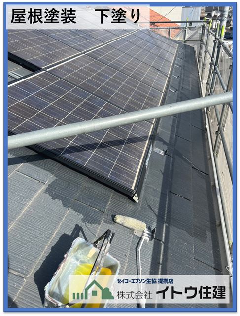 塗装の3工程、下塗りは屋根材の強化と屋根愛と塗料の密着を高めるための塗装です。中塗りは塗料の持つラジカル抑制や遮熱性、防汚性などの機能を塗るための塗装、上塗りは機能とともに色やツヤを出す塗装です。スレートは割れやすいという欠点がありますが、下地強化して塗装しているのでしばらくは大丈夫かと思います。