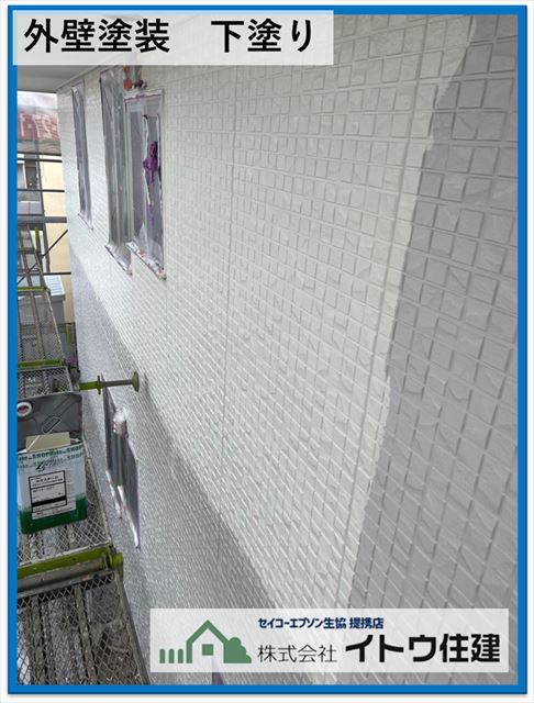 それぞれの工程の役割も屋根と同じです。まずは下塗りをして外壁と塗料の密着を高めます。今回の外壁材は窯業系サイディングです。窯業系サイディングは昼夜の寒暖差や夏冬の寒暖差で伸縮します。その壁材の動きに追随できる弾力性のある下塗りを使用します。使用した塗料は関西ペイントのRSサーフという弾性のある塗料です。