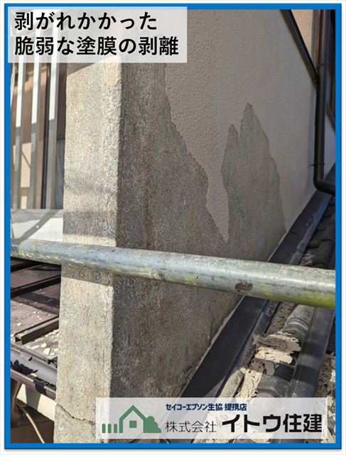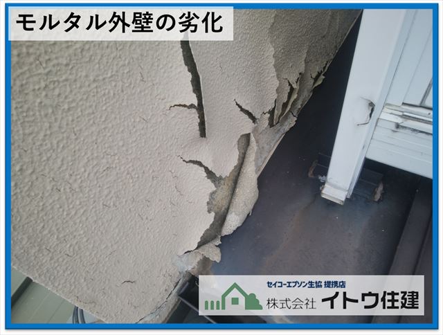 次に外壁です。何か所か塗膜が剥がれているところがありましたが特にひどかったのが、ベランダのわきの外壁の塗膜の剥がれです。これはベランダの上場の笠木という板金が劣化してそこから水が入り、塗膜内部に水が回って剥がれたものと思われます。モルタルはセメントですセメントは水に弱いという弱点があります。そのため表面を塗装して防水しているのですが、内側から水が来てしまっては塗膜も耐えることはできません。