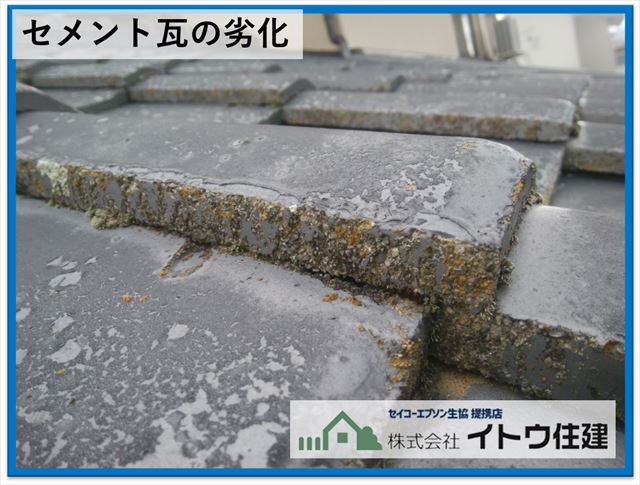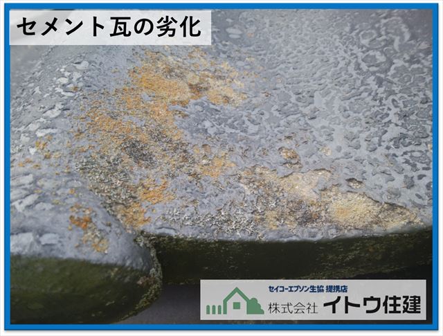 ご覧のように表面の塗膜が剥がれて防水性はほぼないといっていいと思います。ここまで劣化していると塗装は難しいので、セメント瓦を撤去して新しい屋根材を葺く葺き替えの工事をご提案します。ただ今回はあまりコストをかけたくないということで、不具合が生じる可能性があるという前提で塗装工事を行いました。