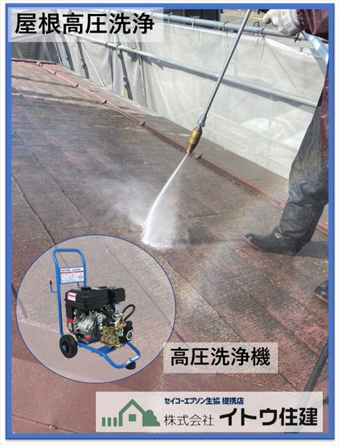 塗装工事において洗浄作業は一番最初に行う大切な作業です。もちろん汚れを落とすのが目的ですが、汚れが付いたまま塗装をすると汚れの上に塗装をすることになり、塗料の密着不良で塗膜が剥がれてしまったりフクレが起きたり等の不具合が生じます。どんなことも初期や下準備、下地作り、基礎が重要です。丁寧に汚れを落とします。私たちプロが使う高圧洗浄機は家電量販店やホームセンターなどで市販されている電動の高圧洗浄機ではなく、写真にのせたようなガソリンエンジンの高圧洗浄機を使います。電動の洗浄機だとほしい水圧を確保できません。ほしい水圧を出そうとするとホースの口を細く絞る必要があります。洗浄面を紙に例えるとボールペンで紙を塗りつぶすイメージです。ボールペンだと紙をきれいに塗りつぶすのは難しいですよね。ガソリンエンジンの洗浄機だとホースの口が広いままほしい水圧を確保できます。筆で紙を塗りつぶそうとするときれいに塗りつぶすのは難しくありませんよね。そんなイメージです。