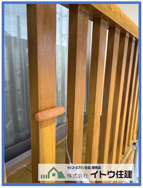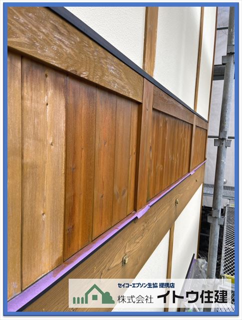 木部塗装の様子です。木部には木部専用の塗料を使います。使用した塗料は和信化学工業のガードラックProです。木部表面に塗膜を作る塗料ではなく、木部に染み込ませて防虫、防カビ、防腐効果で木部を保護する溶剤系(油性)塗料です。塗料が染み込まなくなるまで2回~3回塗装します。