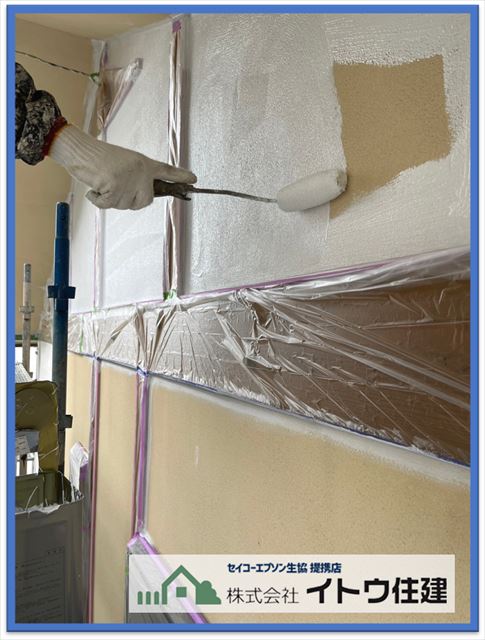 外壁塗装は下塗り、中塗り、上塗りの3回塗りで仕上げます。写真は下塗りの様子です。塗料と塗装面の密着を高める接着剤の役割がある塗料を塗装します。今回使用した塗料はRSサーフ、弾性がある塗料なので振動や地震などの揺れにも対応する塗膜ができます。
