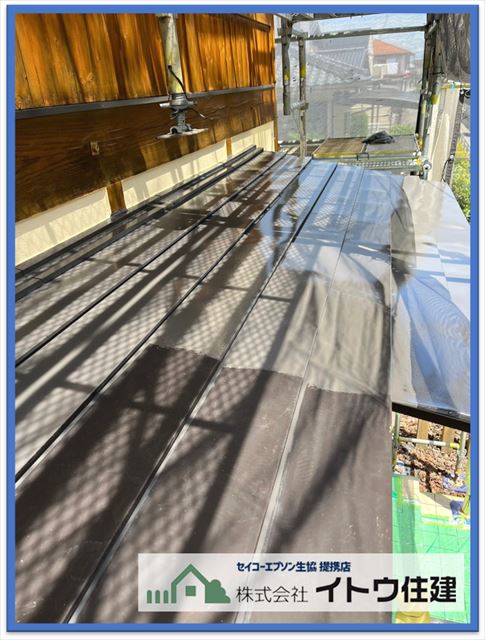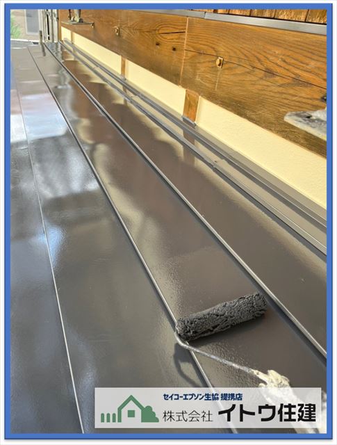 最後に差し掛け屋根の金属部分を塗装しました。使用した塗料は弊社で在庫していたフッ素樹脂塗料ルミステージ弱溶剤GTです。面積があまりなかったので、新しく塗料を購入すると余ってしまいます。色の指定はできませんが他の現場で残った塗料を使えば新たに購入して余らすロスを回避でき、在庫を減らすことができます。お客様にもお安く提供できるので双方にメリットがあります。