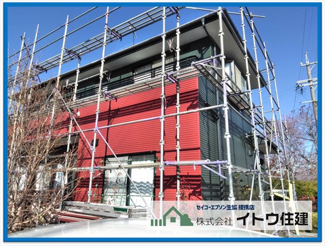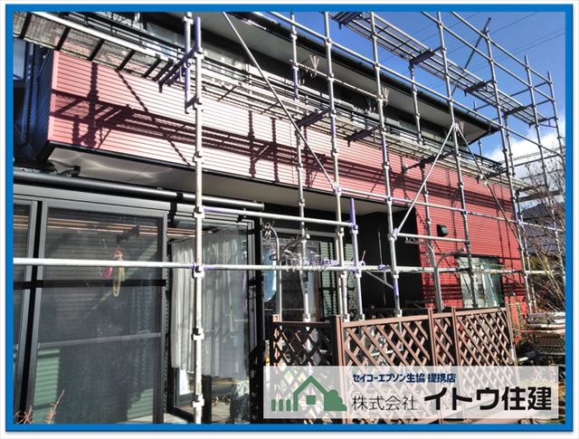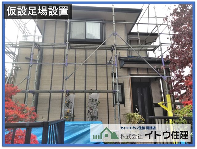 工事の様子です。まずは足場をかけます。工事が終われば解体して形に残らず、費用も30万円くらいかかってしまう足場ですが、工事を安全、安心に行うために必要なものです。ご了承ください。