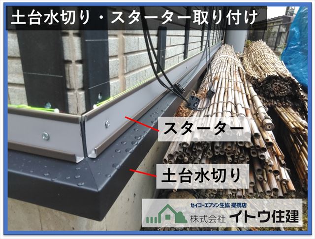 次に基礎と外壁の間に水切りを取り付けます。外壁を伝って落ちてきた雨水を外壁の中に入れないためのものです。その上にサイディングボードを止めるスターターを取り付けます。スターターは少しでも水平が狂って付けてしまうとサイディングがだんだん曲がってついてしまい、見た目もよくありませんし、スターターが1㎜ずれると一番上では2㎝くらいのずれになってしまいます。水平を確認しながら取り付けていきます。