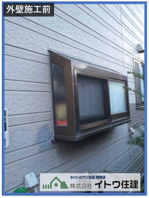 施工前の外壁の様子です。窯業系サイディングの外壁です。窯業系(ようぎょうけい)サイディングはセメントと繊維質を混ぜて凍んで板状に成型した外壁材です。高温にかける際に窯(かま)に入れることから、窯業系サイディングと言われています。サイディングボードの板間目地が劣化しています。シーリングは防水材なのでここから水が入ってしまう可能性があります。写真ではわかりにくいのですがサイディングボードに反りが見られました。窯業系サイディングは寒暖差で伸縮します。その伸縮についていけずに反ったものと思われます。塗装でのメンテナンス方法もありますが、メンテナンスサイクルが短くなってしまうので思い切って新しい金属製のサイディングを重ね張りするほうがいいと思い余す。