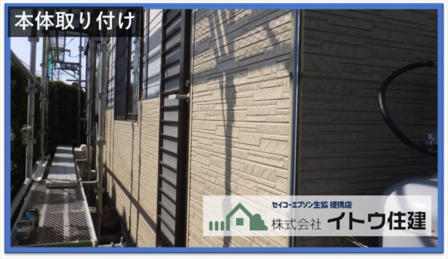 金属サイディング本体を取り付けます。弊社は多くの場合KMEW株式会社の金属サイディングはる一番を採用しています。金属サイディングはガルバリウム鋼板製で柄をプレス加工した後、表面をフッ素樹脂塗料で塗装しています。このとき使うフッ素樹脂塗料も今回屋根で使ったフッ素樹脂塗料と同じAGCコーテックのルミステージを使用しています。