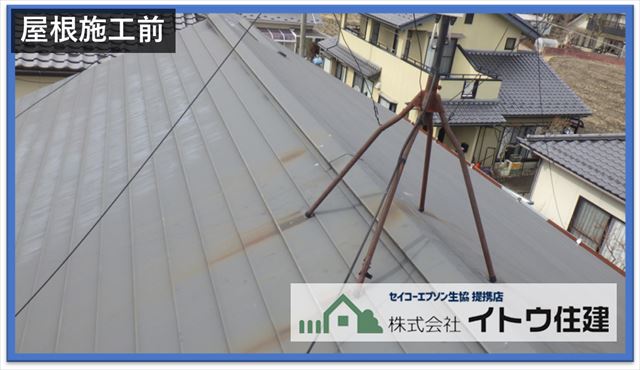 施工前の屋根の様子です。ガルバリウム鋼板の屋根なので屋根材自体にサビは出ていないのですが、雪止めアングルが亜鉛メッキなのでサビが出ています。そのサビが薄っすら屋根材に流れています。またよくあるのですが、使用していないアンテナがそのまま乗っています。アンテナの足はスチール製なので完全にサビていてそのサビが屋根材に流れています。ガルバリウム鋼板はさびにくい屋根材なのですがサビないわけではなく、このようにサビたものがあるともらいサビでサビが回ってしまいます。このサビをきれいに落として塗装する必要があります。