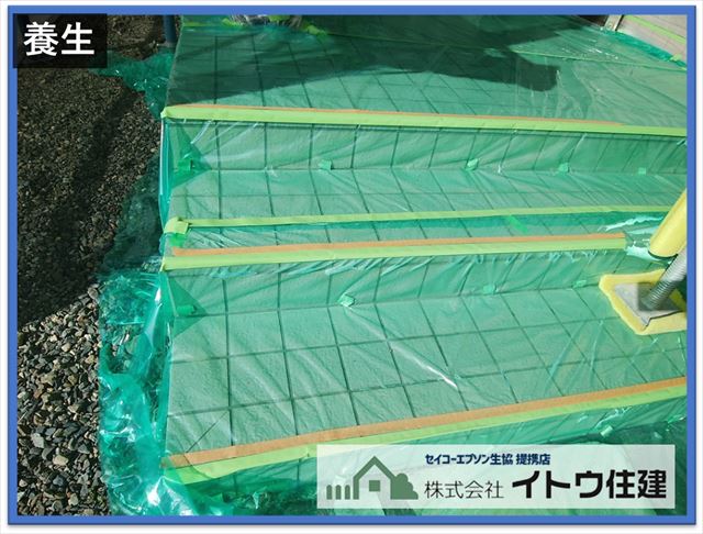 右の写真は玄関ポーチの養生です。もちろん玄関からの出入りはできますが玄関ポーチも普通の養生をしてしまうと滑って危険です。緑色の養生材はノンスリップと言って滑りにくい養生材なのでご安心ください