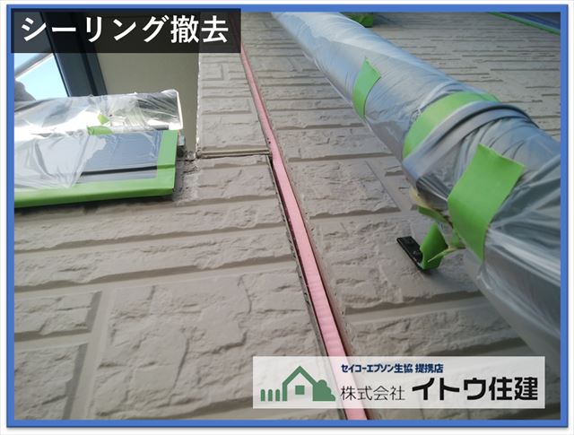 塗装前に古いシーリングを撤去しておきます。一般的にはこの後すぐにシーリングの打ち替えを行うのですが、今回は塗装のあとにシーリングの打ち替えを行うのでこのまま塗装に入ります。