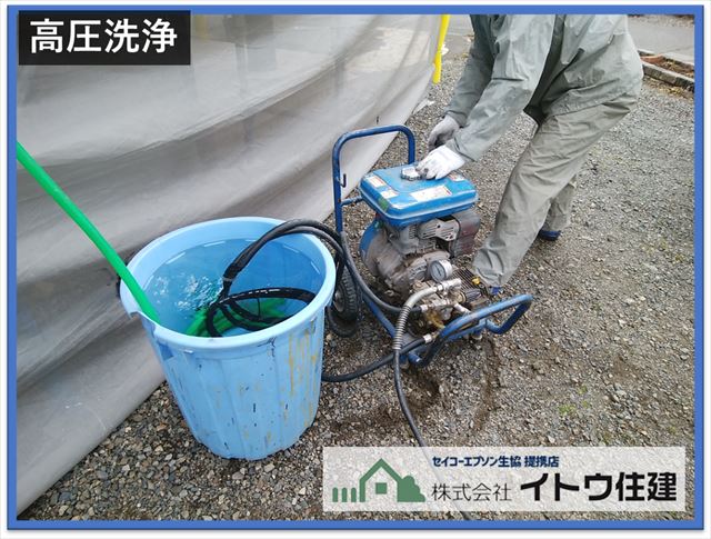 洗浄機は家電量販店やホームセンターなどで市販されている電動の高圧線嘔気ではなく、私たちプロはガソリンエンジンの強力な高圧洗浄機を使用します。電動の洗浄機だと水圧が足りず、ホースの口を限界まで絞って吐水口を細くして水圧を高める必要があります。洗浄面を紙で例えるとボールペンで紙を塗りつぶすイメージです。きれいには塗れず紙の部分が残ってしまいますよね。それと同じように洗浄面に洗浄ムラができてしまいます。私たちが使う洗浄機はもともと水圧が強いのでホースを絞る必要はありません。紙を筆で塗りつぶすイメージです。塗りムラがなくきれいに塗りつぶせると思います。同様に洗浄ムラもなくきれいに洗浄することができます。